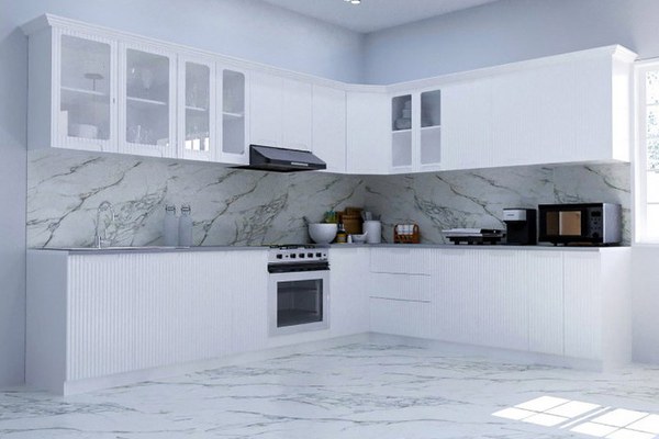 Set bucatarie SPACE COLT 300x250 cm, 15 corpuri, blat termorezistent, fronturi MDF, alb rustic