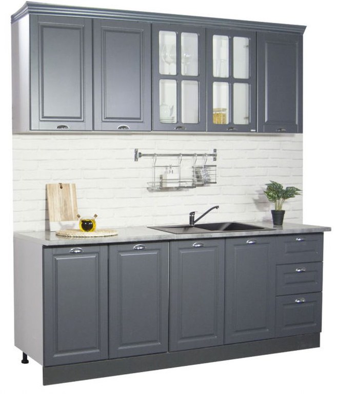 Setul conține: 2 x Corp inferior 80 cm 2 uși 1 x Corp inferior 40 cm 3 sertare 1 x Corp suspendat 80 cm 2 uși 1 x Corp suspendat 80 cm cu geamuri 1 x Corp superior 40 cm Blatul termorezistent are grosime de 28mm si este compus din 2 bucati:...