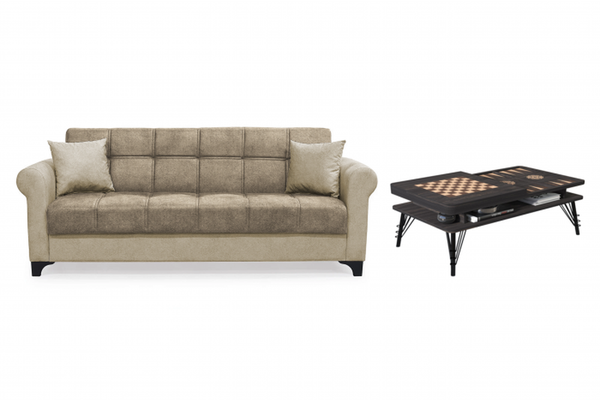 Set Canapea SALLY extensibila, maro + bej si masuta cafea TABLE, wenge