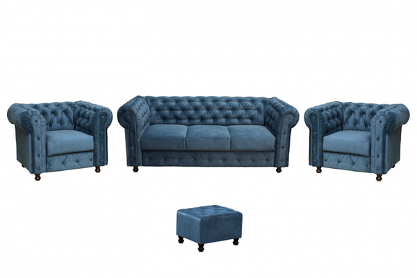 Set CHESTERFIELD 3-1-1, canapea extensibila 3 locuri si 2 fotolii fixe, albastru + 1 Taburet Cadou