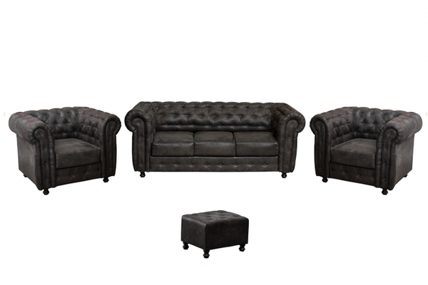 Set CHESTERFIELD 3-1-1, canapea extensibila 3 locuri si 2 fotolii fixe, negru + 1 Taburet Cadou