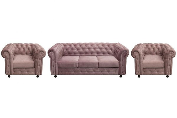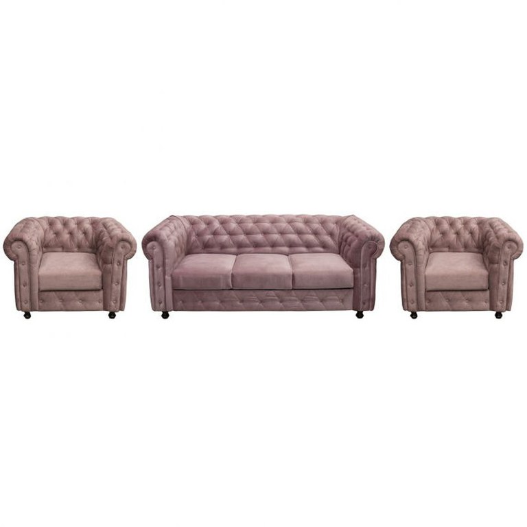 Set CHESTERFIELD 3-1-1, canapea extensibila 3 locuri si 2 fotolii fixe, roz prafuit