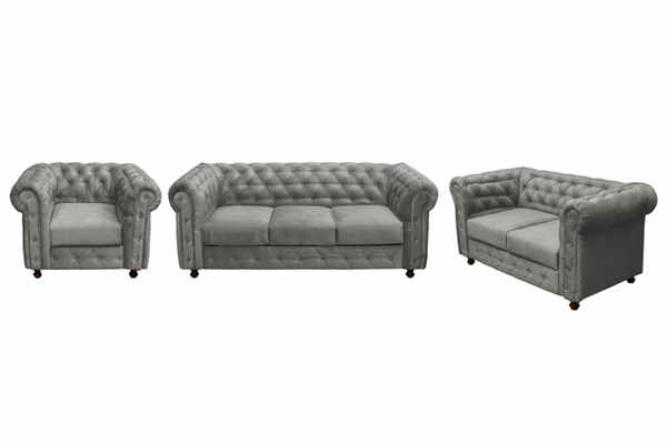 Set CHESTERFIELD 3-2-1, canapea extensibila 3 locuri, canapea fixa 2 locuri si fotoliu fix, gri deschis