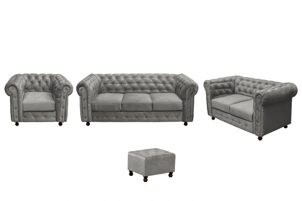 Set CHESTERFIELD 3-2-1, canapea extensibila 3 locuri, canapea fixa 2 locuri si fotoliu fix, gri deschis + 1 Taburet Cadou