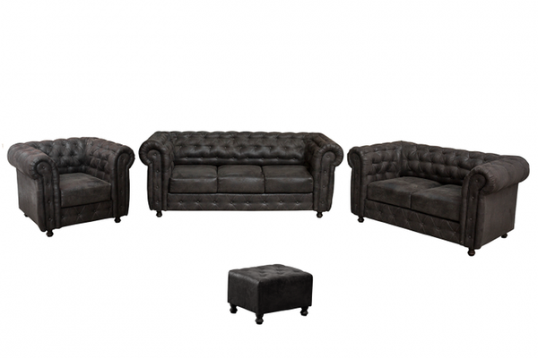 Set CHESTERFIELD 3-2-1, canapea extensibila 3 locuri, canapea fixa 2 locuri si fotoliu fix, negru + 1 Taburet Cadou