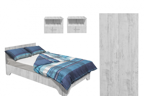 Set dormitor ALMA, 4 piese, pat 120x200 cm, dulap 2 usi, 2 noptiere, pin antichizat