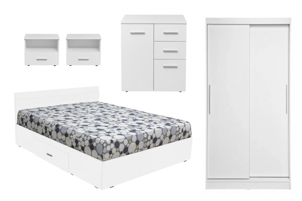 Set dormitor ALMA, 5 piese, pat 160x200 cm, dulap usi glisante, comoda, 2 noptiere, alb