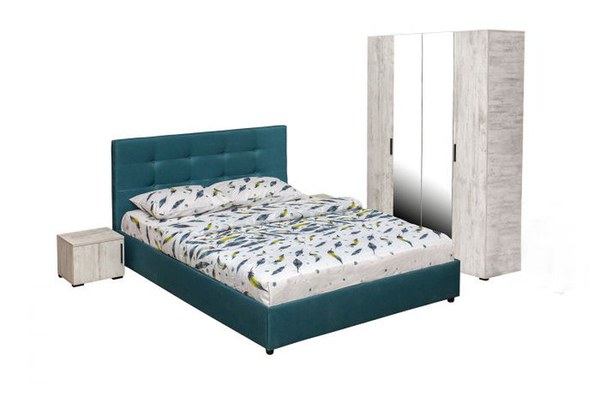 Set dormitor ECONO, 4 piese, pat 140x200 cm, dulap 4 usi, 2 noptiere, pin antichizat + turcoaz