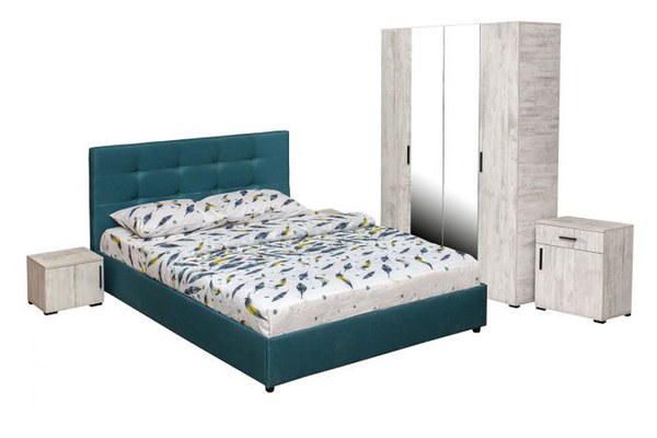 Set dormitor ECONO, 5 piese, pat 160x200 cm, dulap 4 usi, comoda, 2 noptiere, pin antichizat + turcoaz