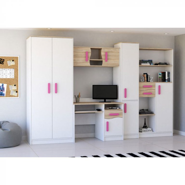 Set dormitor tineret MACIUS, 5 corpuri, PAL alb + sonoma, manere culoare roz, 300x52x197 cm