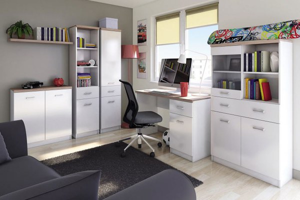 Set dormitor TOP MIX, 5 piese, birou, vitrina, 2 biblioteci, comoda, alb