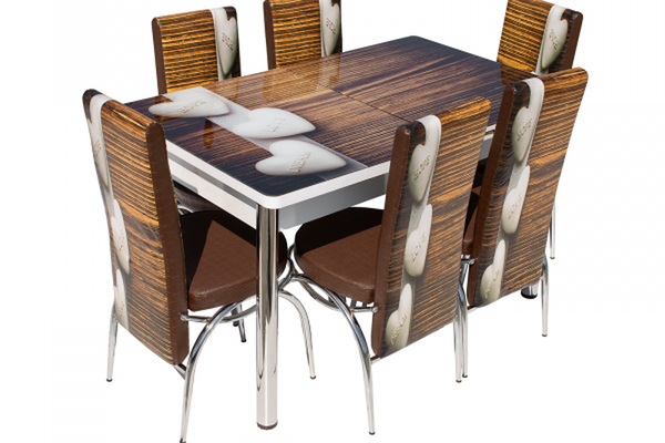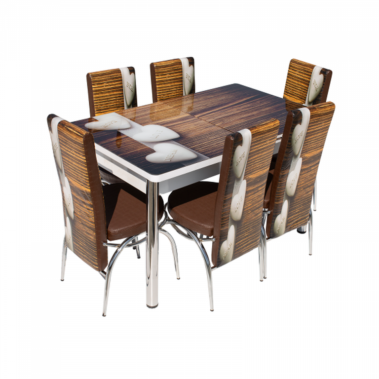 Set Lara, masa extensibila cu 6 scaune print, maro inimi, 130 165x80x79 cm