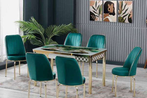 Set LION GOLD, masa extensibila cu 6 scaune, dreptunghiulara, alb print verde + auriu + verde, 130 170x80x75 cm
