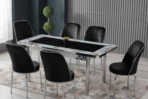 Set LION SILVER, masa extensibila cu 6 scaune, dreptunghiulara, marmura + argintiu + negru, 130 170x80x75 cm