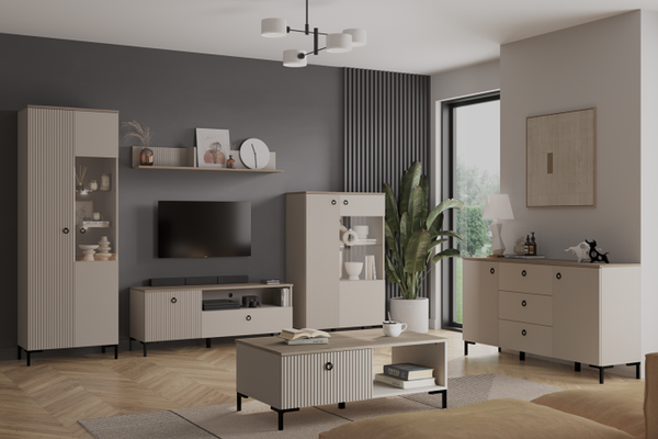 Set Living DOMINICA, 6 piese, 2 vitrine, comoda TV, comoda, masuta de cafea, raft suspendat, taupe + stejar silverjack, 440x41x199 cm