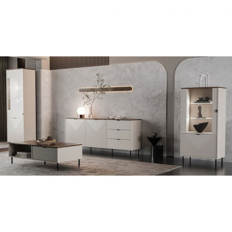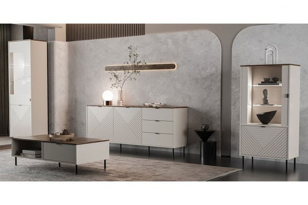 Set Living EVO, 4 piese, 2 vitrine, comoda, masuta cafea, casmir + stejar castello, 315x40x135 cm