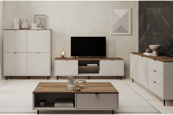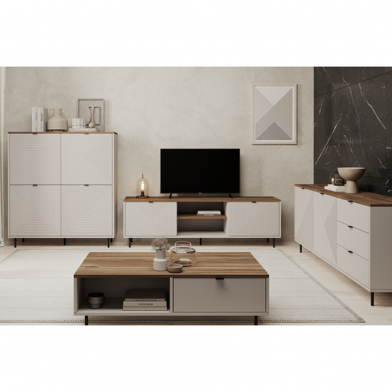 Set Living EVO, 4 piese, comoda TV, comoda, biblioteca, masuta cafea, casmir + stejar castello, 490,2x40x135,2 cm