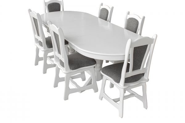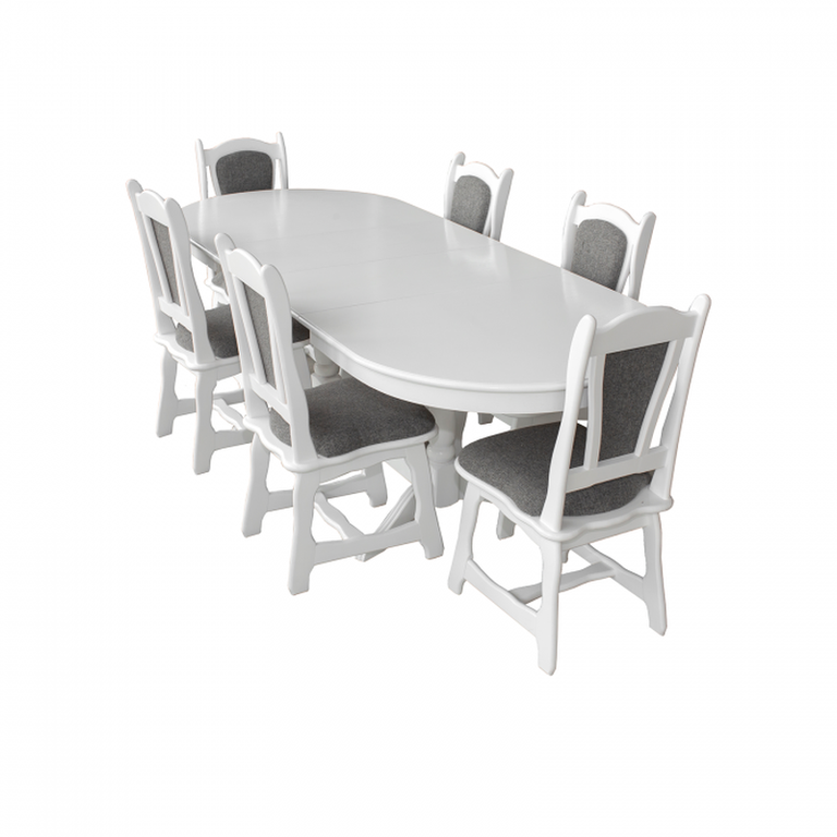 Set masa extensibila EUROPA ovala cu 6 scaune IZA stofa gri, lemn masiv, alb, 160 240x90x70 cm