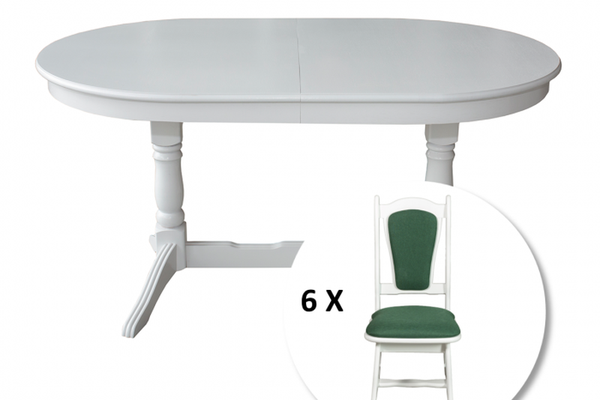 Set masa extensibila EUROPA ovala cu 6 scaune IZA stofa verde, lemn masiv, alb, 160 240x90x70 cm