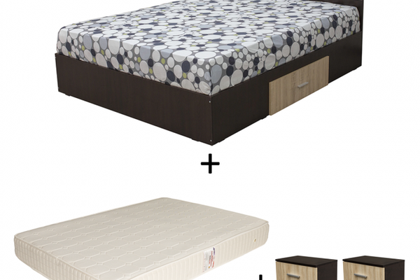 Set Pat Alma, cu sertar, sonoma inchis + deschis + Saltea superortopedica, 160x200 cm + 2 Noptiere ALMA, 2 sertare