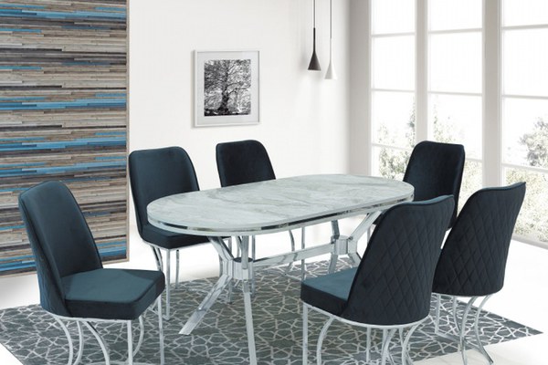 Set TIMARA, masa cu 6 scaune, ovala, 6 persoane, marmura bermuda + argintiu + gri, 160x80 cm