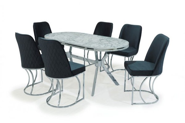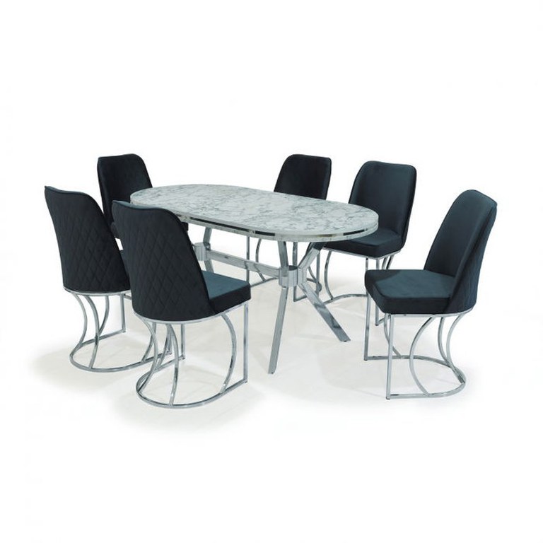 Set TIMARA, masa cu 6 scaune, ovala, 6 persoane, marmura carrara+ argintiu + gri, 160x80 cm