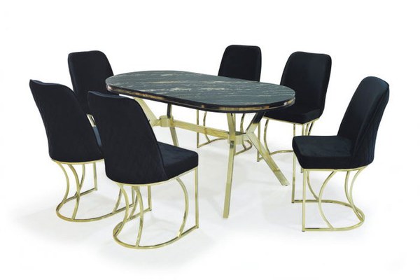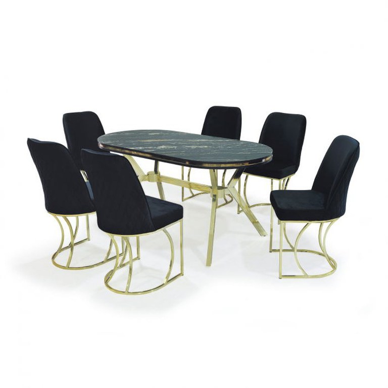 Set TIMARA, masa cu 6 scaune, ovala, 6 persoane, marmura luanda + auriu + negru, 160x80 cm