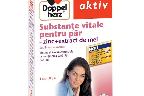 Doppelherz, Aktiv, Substante vitale, par - Avand biotina, zinc si ulei de germeni de grau si extract de mei, acest produs contribuie la mentinerea sanatatii parului si pielii