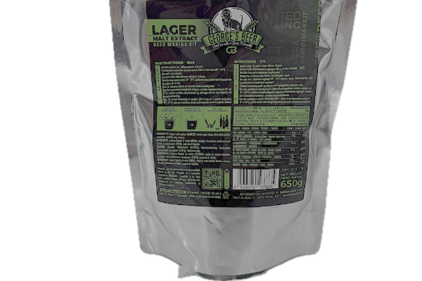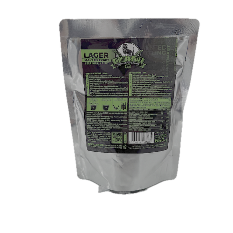 Malt bere George's Beer Lager 650 gr (pentru 5L bere) + drojdie fermentare 2,5 gr Bere LAGER – cunoscută pentru gustul prospăt și curat, tinde să fie mai puțin complexă decât alte tipuri de bere, cu o dulceață moderată și un gust amărui echilibrat. Instrucțiuni de utilizare: - Separați plicul cu drojdie de pachetul cu malț; - Introduceți punga în apă fierbinte / clocotită timp de 10 minute - Se toarnă conținutul pungii în vasul de fermentare și se adaugă 500 ml de apă fierbinte (60°-70°C) - Amestecați 2–3 minute; - Completați până la 5 litri cu apă rece și amestecați timp de 5 minute - Odată ce temperatura ajunge la 18° –24°C, presărați drojdia (pliculețul de sub pungă) pe suprafață (nu amestecați) - Închideți vasul de fermentare cu capacul, introduceți supapa Air-Lock care să conțină apă. - Odată ce fermentația este completă (5-8 zile la o temperatură constantă între 18° și 24°C), îmbuteliați în sticle folosind robinetul vasului, adăugați în fiecare sticlă zahăr cu dozatorul de zahăr și capsați sticlele. - Odată ce a doua fermentație este completă (10-14 zile la o temperatură constantă 18°- 2 4°C, în sticlă), savurați berea dvs. Note: toate instrumentele și vasul de fermentare trebuie să fie bine sterilizate. Ingrediente: - Extract lichid de malț – orzoaică - Sirop de zahăr invertit - Drojdii uscate - Extract de hamei Depozitare: - Loc rece și uscat - Ferit de acțiunea directă a radiației solare Made in UK