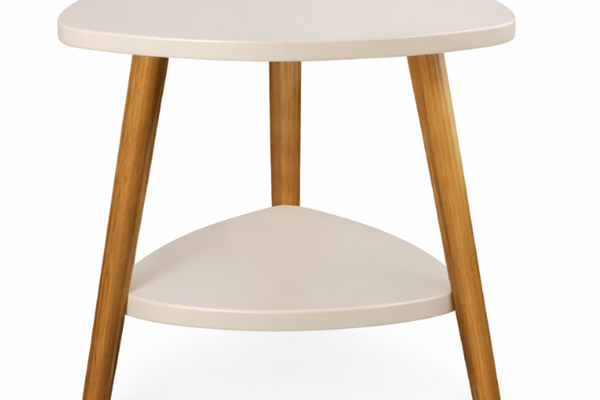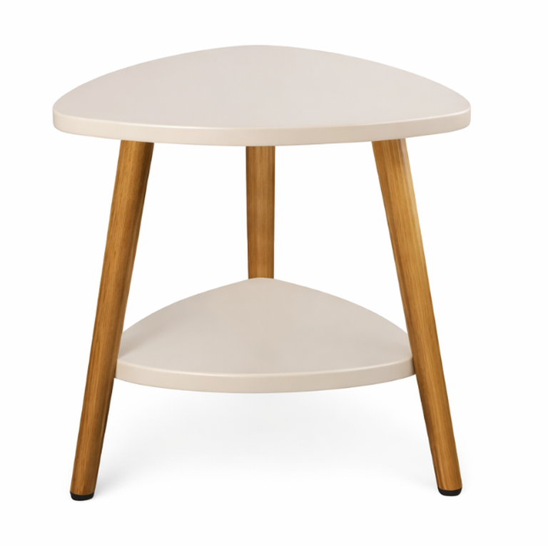 Masuta moderna cu 2 polite blat alb si picioare din lemn 50 x 40 cm triunghi