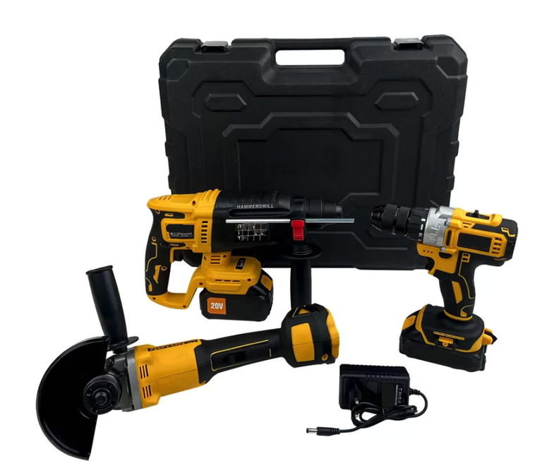 Set complet de scule electrice pe acumulator, ideal pentru lucrări de bricolaj și uz semi-profesional. Include bormașină, rotopercutor și polizor unghiular (flex), toate alimentate de acumulatori Li-Ion pentru mobilitate și eficiență ridicată. Design ergonomic, ușor de manevrat, potrivit pentru lucrări precum găurire, înșurubare, tăiere și spargere ușoară. Setul vine însoțit de valiză de transport, încărcător și accesorii esențiale. O soluție practică și versatilă pentru orice gospodărie sau atelier, oferind putere bună la un preț accesibil. Specificații tehnice Tip acumulator: Li-Ion (2 bucăți) Încărcare: 220–240V Conținut pachet: Bormașină / autofiletantă Ciocan rotopercutor Polizor unghiular (flex) Încărcător Valiză transport Viteză bormașină: până la ~1500 rpm Cuplu maxim: ~40–45 Nm Rată percuție rotopercutor: până la ~5000 bpm