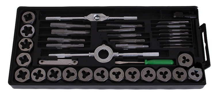 Specificatii tehnice Numar componente/kit: 40 Dimensiune: M3x0.5, 3x0.6, 4x0.7, 4x0.75, 5x0.8, 5x0.9, 6x0.75, 6x1.0, 7x0.75, 7x1.0, 8x1.0, 8x1.25, 10x1.25, 10x1.5, 12x1.5, 12x1.75, 1/8NPT27 Contine: Tarozi si filiere 17 pcs. Maner pentru tarod 1 buc. Maner pentru filiera 1 buc. Maner pentru tarods tip "T" 1 buc. Surubelnita 1 buc. Lera pentru filete 1 buc.