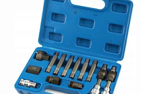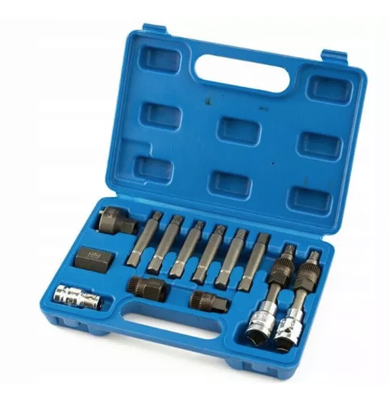 Trusa chei pentru alternator, 13 piese, CHEI PENTRU ALTERNATOR - SET 13 EL. Permite repararea usoara a alternatorului si demontarea/montarea scripetei curelei.Componente din otel Cr-V. Aplicatie: VW, Audi, Seat, Mercedes, Renault, BMW, Fiat etc. – T50 x 110 mm L - M10 x 110 mm L – 5mm x 33T HEX – 22mm x 33T HEX - 22 mm HEX – 35 mm – capac rotund – Adaptor: 1/2″ DR. x 10MM HEX – BIȚI 10mm x 75L: T40, T50 / M8, M10 / H8, H10