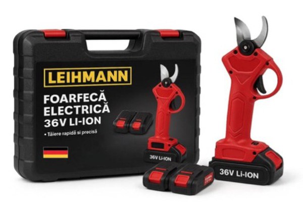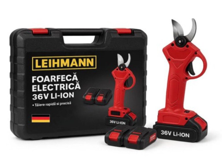 Foarfeca electrică pentru viță de vie și crengi cu 2 acumulatori 48 V este un instrument puternic și eficient pentru grădinărit, viticultură și pomicultură, special conceput pentru tăierea rapidă și precisă a crengilor groase fără efort manual. Echipată cu două baterii Li-Ion de mare capacitate, oferă autonomie extinsă pentru sesiunile prelungite de lucru în vie, livadă sau gard viu. Designul ergonomic și greutatea redusă fac manevrarea confortabilă, reducând oboseala. Lamele din oțel dur sunt rezistente și asigură tăieri uniforme, iar utilizarea simplă printr-un singur buton crește eficiența. Perfectă pentru profesioniști și pasionați de grădinărit. Specificații tehnice Tip: foarfecă electrică pentru viță de vie și crengi Alimentare: 2 acumulatori Li-Ion 48 V (de obicei 5 Ah) Diametru maxim de tăiere: până la ~30 mm Autonomie: până la ~3.5 ore cumulativ Timp de încărcare: ~2 ore Lame: oțel de calitate, durabile Design: ergonomic, ușor de manevrat