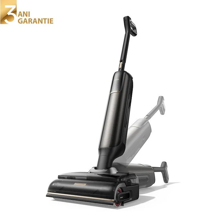 Aspirator vertical cu spalare Mova M50 Ultra Wet and Dry Vacuum Cleaner - Descriere Curatarea zilnica devine mai precisa atunci cand puterea, controlul si igiena lucreaza impreuna. Mova M50 Ultra imbina aspiratia de 22.000 Pa, presiunea activa asupra podelei si sistemele inteligente de adaptare automata pentru a gestiona eficient murdaria uscata si umeda, inclusiv reziduurile dificile de pe suprafete dure. Tehnologiile avansate integrate permit acces facil sub mobilier jos, dozare automata a solutiei de curatare si mentinerea periei in conditii optime prin autocuratare cu apa la 100°C si uscare rapida. Cu asistenta inteligenta la manevrare, control prin aplicatie si autonomie de pana la 40 de minute, Mova M50 Ultra este conceput pentru locuinte moderne care cer rezultate constante si control fara compromisuri. Aspirator vertical cu spalare Mova M50 Ultra Wet and Dry Vacuum Cleaner are urmatoarele caracteristici principale: Garantie 3 ani (atat pentru persoane fizice cat si pentru persoane juridice) Tehnologie de spalare si uscare a periei la 100°C; Putere de aspirare 22.000Pa; Autonomie: pana la 40 min; Motor de 450 W; Recipient apa curata 800ml; Recipient apa murdara 700ml; Dispozitivul este dotat cu un acumulator de 4000mAh; Greutatea aspiratorului 5.8 kg. Acoperire tripla reala 0-Gap cu brat robotic Tehnologia EdgeCoverage™ AI permite aspiratorului Mova M50 Ultra sa curete eficient zonele greu accesibile de-a lungul peretilor. Bratul robotic integrat in partea frontala a periei cu rola se extinde activ in timpul functionarii, ajungand in golurile dintre podea si perete si asigurand o acoperire reala fara spatii ramase necuratate. In momentul deplasarii inapoi, bratul coboara rapid si razuieste fin suprafata, in timp ce sistemul umed-uscat indeparteaza simultan apa reziduala. Astfel, podeaua ramane curata si aproape uscata, fara urme vizibile de apa, chiar si dupa spalare. Dozare automata a solutiei de curatare Mova M50 Ultra este echipat cu un rezervor integrat pentru solutia de curatare, care permite amestecarea automata a detergentului cu apa in timpul utilizarii. Sistemul inteligent regleaza proportia in functie de volumul de apa utilizat, mentinand un raport constant si eficient pe toata durata procesului de curatare. Astfel, se asigura o spalare uniforma a suprafetelor si elimina necesitatea ajustarilor manuale, oferind o experienta de utilizare simpla si eficienta, indiferent de nivelul de murdarie. Racleta tip pieptene pentru prevenirea incurcarii parului aspirat Racleta tip pieptene, pozitionata langa perie, este proiectata pentru a capta eficient firele de par inca din timpul aspirarii. Designul sau permite directionarea parului catre sistemul de colectare, reducand semnificativ riscul ca acesta sa se infasoare in jurul periei. Chiar si parul fin de animale, in cantitati mari, este colectat eficient, mentinand performanta constanta si un flux de curatare uniform pe intreaga suprafata. Aspirator vertical cu spalare Mova M50 Ultra Wet and Dry Vacuum Cleaner - Putere mare de aspiratie si presiune activa pentru curatare profunda Mova M50 Ultra asigura o putere de aspiratie de pana la 22.000 Pa, capabila sa indeparteze eficient murdaria uscata si umeda, inclusiv reziduurile aderente de pe suprafete dure. Sistemul de aspirare actioneaza constant, mentinand performanta ridicata indiferent de tipul de murdarie. Pe langa aspiratie, aparatul aplica aproximativ 20 N de presiune pe podea, permitand periei sa frece podeaua in mod controlat si eficient. Aceasta combinatie contribuie la indepartarea petelor dificile, fara a necesita treceri repetate sau efort suplimentar. Acces lie-flat 180° fara pierderea puterii de aspirare Tehnologia Lie-Flat Reach permite aspiratorului Mova M50 Ultra sa fie utilizat la 180°, aproape paralel cu podeaua, mentinand o aspiratie constanta. Aparatul aluneca cu usurinta sub mobilier cu inaltime redusa, de aproximativ 13–14 cm, fara a afecta performanta de curatare. Chiar si in aceasta pozitie joasa, sistemul de aspirare si spalare functioneaza eficient, asigurand curatarea zonelor greu accesibile, de obicei ignorate in timpul curateniei. Detectare inteligenta a murdariei si ajustare automata puterii de aspirare Mova M50 Ultra este echipat cu un senzor inteligent de murdarie, capabil sa identifice tipul de reziduuri si nivelul de incarcare de pe perie in timp real. Pe baza acestor informatii, sistemul adapteaza modul de functionare pentru a mentine eficienta constanta. In modul Smart, aspiratia si cantitatea de apa sunt reglate automat in functie de tipul si gradul de murdarie, asigurand o curatare echilibrata si precisa, fara interventii manuale. Aspirator vertical cu spalare Mova M50 Ultra Wet and Dry Vacuum Cleaner - Spalare a periei la 100°C pentru igienizare avansata Mova M50 Ultra foloseste apa la 100°C pentru spalarea profunda a periei, descompunand eficient grasimea si murdaria acumulate. Procesul asigura un nivel ridicat de igienizare, cu o rata de sterilizare de pana la 99,99%, mentinand peria curata dupa fiecare utilizare. Datorita senzorului de murdarie integrat, sistemul poate declansa automat un ciclu suplimentar de respalare in timpul autocuratarii, atunci cand este detectat un nivel ridicat de reziduuri, pentru o curatare completa si controlata. Uscare rapida a periei in 5 minute Mova M50 Ultra utilizeaza un sistem combinat de centrifugare si aer fierbinte la 90°C, care elimina eficient umiditatea din peria cu rola in aproximativ 5 minute. Procesul este gandit pentru a reduce timpul de asteptare intre utilizari si pentru a mentine peria in conditii optime. Designul etans directioneaza fluxul de aer in mod controlat, asigurand o functionare eficienta si silentioasa, fara pierderi de caldura sau zgomot suplimentar. Aspirator vertical cu spalare Mova M50 Ultra Wet and Dry Vacuum Cleaner - Uscare inteligenta automata Prin intermediul aplicatiei, Mova M50 Ultra ajusteaza automat durata ciclului de uscare in functie de nivelul de umiditate 