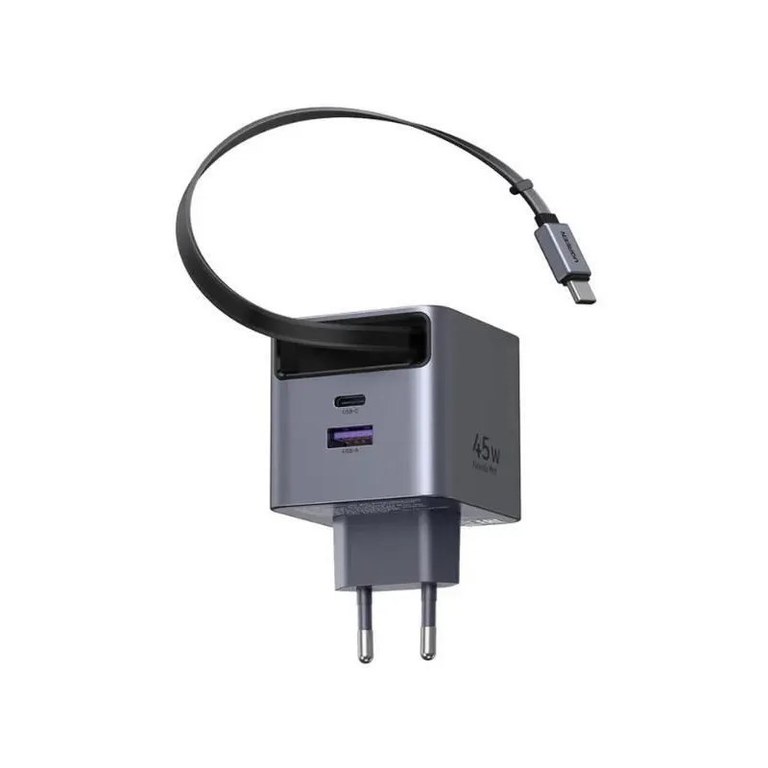 Incarcator rapid cu cablu retractabil UGREEN 45W GaN Fast Charger X614, 2 x USB C + 1 x USB A, Gri