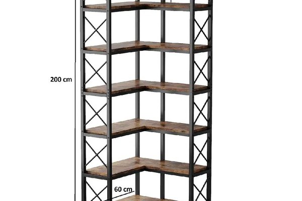 Biblioteca pentru colt decorDimentiune:Inaltime :200 cmLungime drepta:60 cm (din fata 36 cm)Lungime stanga:60 cm (din fata 36 cm)Latime :24 cmMaterial :- Metal profil 20x20 cm - Pal melaminatShelf thickness: 1,8 cmMetal profile dimensions: 20x20 mm