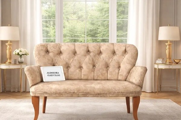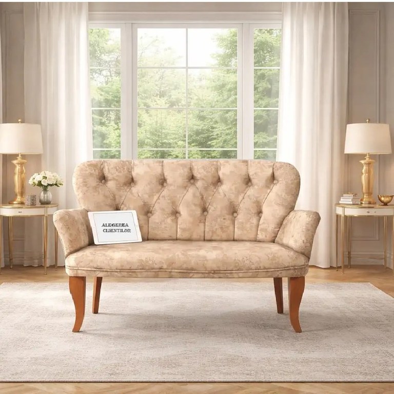 Canapea 2 locuri Berta bej – design Chesterfield elegant pentru spații rafinateCanapea de 2 locuri Berta aduce un aer sofisticat și primitor în orice încăpere. Modelul este tapițat într-o stofă premium bej-auriu, cu textură fină și completat de picioare din lemn sculptat. Canapeaua Berta este potrivită atât pentru livingurile elegante, cât și pentru holuri, recepții, cafenele sau restaurante în care designul elegant este o prioritate. Spătarul înalt, ușor arcuit, este evidențiat de butonii tip Chesterfield, îmbrăcați în același material rafinat, dispuși într-un model clasic romboidal. Tapițeria reflectă delicat lumina, iar picioarele înalte, din lemn, cu formă cabriole, completează aspectul clasic și asigură o bună stabilitate piesei.Caracteristici și avantaje ale canapelei de 2 locuri Berta Design Chesterfield autentic, model clasic cu butoni.Tapițerie premium, în nuanță bej-auriu, cu textură plăcută la atingere și aspect rafinat.Spătar înalt și ușor curbat, pentru un nivel ridicat de confort.Picioare din lemn masiv, sculptate în stil clasic cabriole, pentru stabilitate și eleganță.Format compact de 2 locuri, ideal pentru livinguri, holuri, recepții sau spații HoReCa.Design versatil, potrivit pentru amenajări clasice, baroce, vintage sau eclectic moderne.Montaj simplu – produsul se livrează neasamblat, fiind necesară fixarea picioarelor.DimensiuniLungime: 130 cmAdâncime: 65 cmÎnălțime picioare: 34 cmMaterialeTapițerie: stofă premium, finisaj bej-auriuStructură și picioare: lemn, finisaj maroDescoperă și alte canapele și fotolii, canapele extensibile sau fotolii fixe sau extensibile, și completează amenajarea cu mese de cafea și piese decorative, pentru un spațiu plin de personalitate.