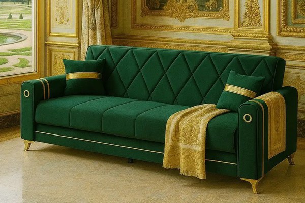 Canapea extensibila cu lada de depozitare 220x87x93 cm , detalii aurii,verde – Camara