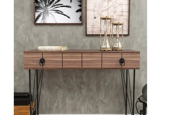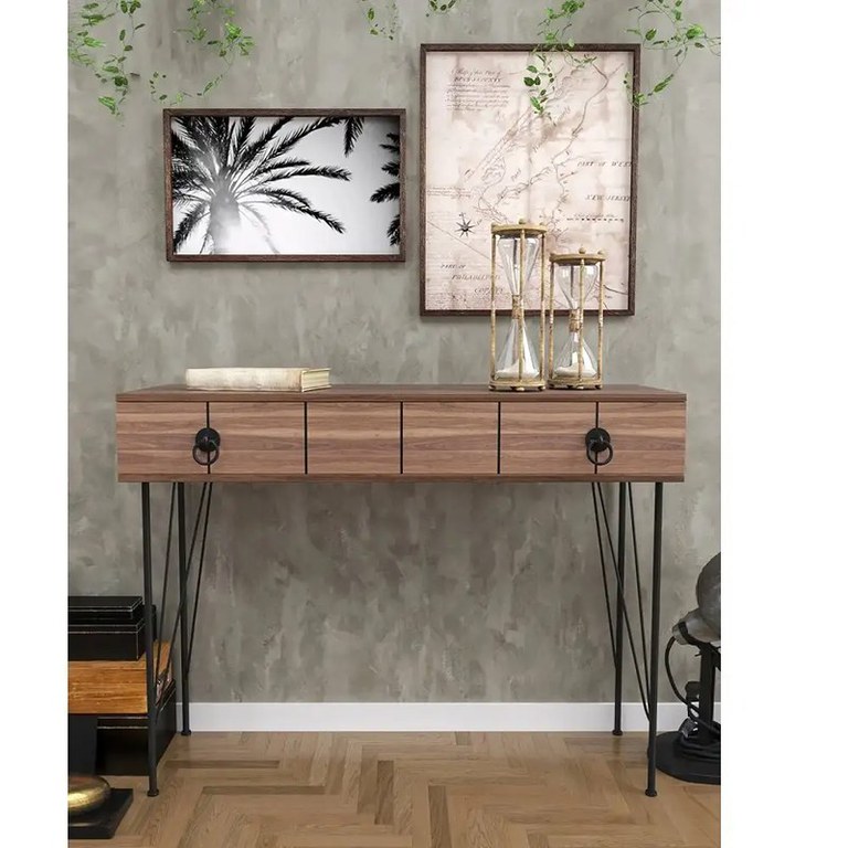 Consola pentru hol Aida culoare nuc negru Dimentiune:Inaltime: 90 cmLungime:120 cmLatime: 35 cmMaterial:Pal MelaminatPicior MetalCuloare Corp :NucPicioare :Negru