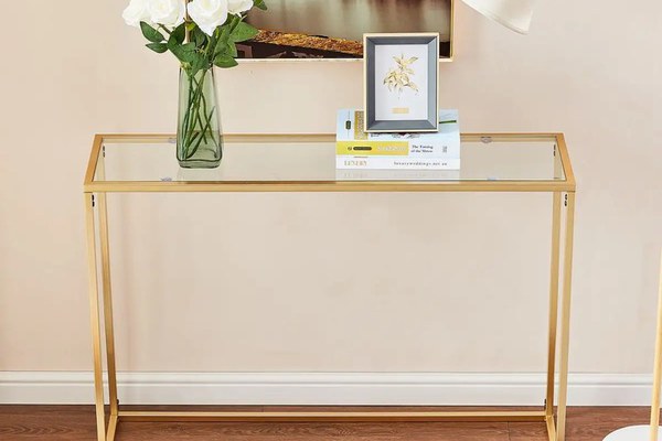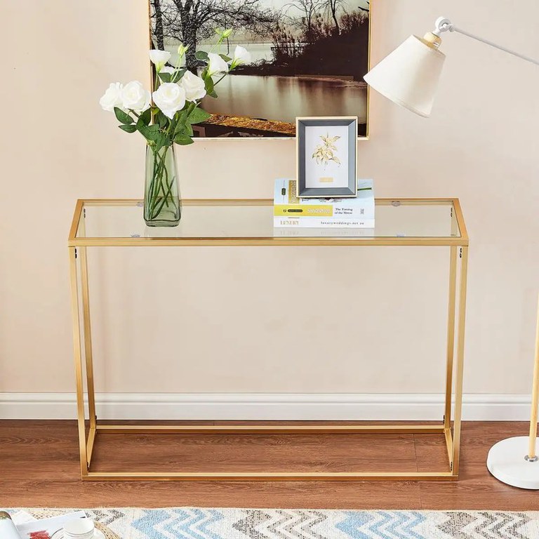 Consola metal-sticla auriu Deco seria D-710, homs,100x30x80 cm ,0030Dimensiuni:L 1000, l 300, h 800 mm Profil metalic, vopsit electrostaticMaterial: Metal și blat de sticlăPachet : neasamblat