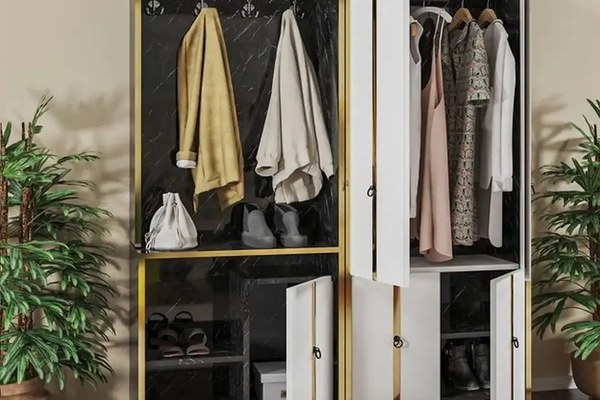 Cuier hol cu pantofar alb-auriu-negru,Homs 181 x 35.6 x 138.2 cm un spatiu mai bine organizat in casa taMobilier pentru hol stil modern elegant. Este compartimentat astfel incat sa iti fie folositor- agatatori pentru haine, bara umerase cu usi , rafturi pentru incaltaminteCombinatie de culoari- negru marmorat, auriu si alb.Reazalizat din pal de 18 mmSe livreaza neasamblat, impreuna cu schita si accesorii montaj. Asamblarea se face de catre beneficiar, urmarind desenele de pe schita. Dimensiuni: L 138.2, l 35.6, h 181 cm