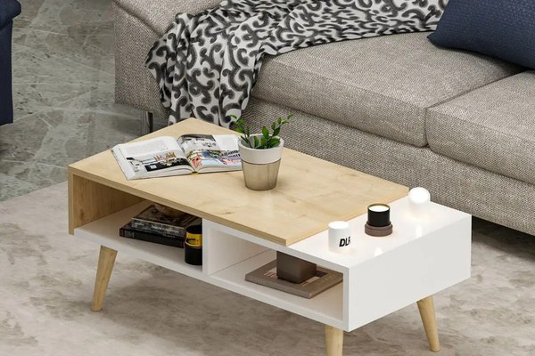 Masa de cafea cu design modern cu spatiu de depozitare. Combinatie de culori versatila- alb cu stejar. Realizata din pal de 18 mmSe livreaza in toata tara prin curier neasamblat, coletul fiind insotit de schita si accesorii montaj.Asamblarea se face de catre beneficiar.Dimensiuni:L 90, l 45, h 40 cmGreutate: 15 kg