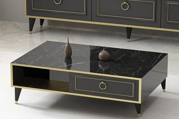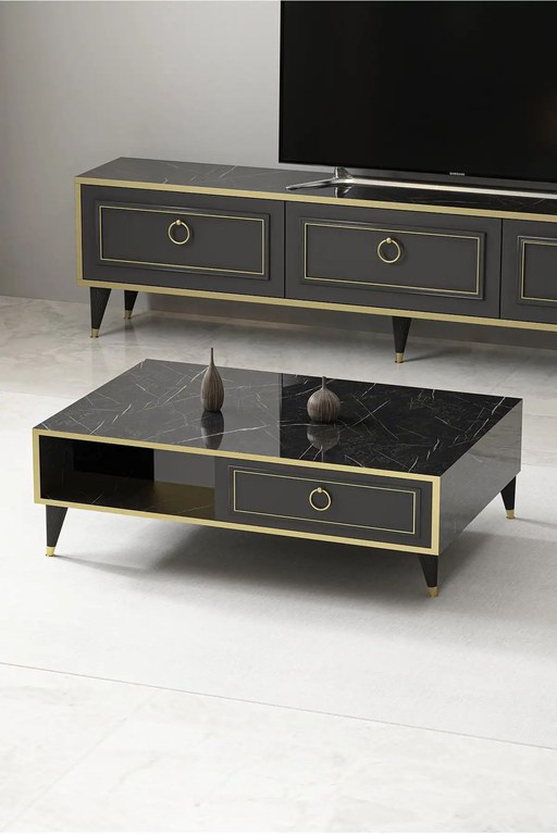 Masa de cafea din gama Vals, o masa eleganta ce are corpul negru cu decor marmorat cu canturi auriu.Masa este compartimentata cu 2 spatii depozitare cu usi batante. Se potriveste perfect cu comoda tv din aceeasi gama.Realizata din pal 18 mm.Se livreaza neasamblat, insotit de schita si accesorii montaj. Asamblarea se face de catre beneficiar, urmarind desenele de pe schita.Curatarea se face cu o carpa alba moale si solutii de curatare neabrazive. Dimensiuni:L 90, l 60, h 40 cm