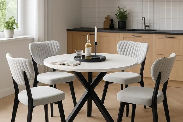 Masă de bucătărie rotundă Homs alb și negru – lumină și echilibru în zona ta de diningCreează un spațiu luminos și armonios în bucătărie sau zona de dining cu masa rotundă Homs, cu blat alb din MDF și structură metalică neagră. Finisajul alb aduce senzația unui spațiu aerisit și curat, în timp ce forma rotundă favorizează conversația și momentele petrecute împreună. Picioarele metalice negre, dispuse central într-o structură tip buchet, oferă stabilitate și un contrast vizual modern, ușor de integrat în amenajări contemporane sau minimaliste. Dimensiunea compactă face masa ideală inclusiv pentru spații medii sau mici.Caracteristici și avantajeBlat rotund din MDF, cu finisaj albFormă rotundă care încurajează conversația și creează o atmosferă primitoare la masă.Picioare metalice negre robuste, cu structură centrală tip buchet, pentru stabilitate și impact vizual.Contrast cromatic rafinat între blatul alb și picioarele negre.Compactă, ideală și pentru spații medii sau mici.Suprafață rezistentă, ușor de întreținut.DimensiuniLungime: 80 cmLățime: 80 cmÎnălțime: 75 cmDiametru blat: 80 cmMaterialeBlat: MDF texturat, finisaj alb Structură: metal, finisaj negruDescoperă și alte mese de bucătărie, scaune de bucătărie, tabureți și alte piese de mobilă pentru bucătărie, creând astfel un spațiu de dining armonios, unde eleganța și funcționalitatea se întâlnesc.