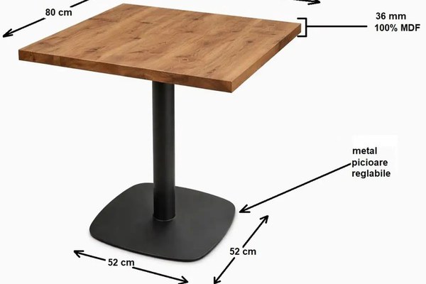 Masă bucătărie pătrată din MDF texturat nuc 80×80 cm – compactă și elegantăTransformă zona de dining într-un spațiu cald și primitor cu masa noastră pătrată din MDF texturat, perfectă pentru apartamentele mai mici sau pentru garsoniere. Blatul în nuanța de nuc texturat, cu striații vizibile de lemn, oferă un look elegant și natural, aducând căldură și personalitate interiorului, iar piciorul metalic robust, cu profil de 60×60 mm, adaugă un plus de stabilitate și un aer urban-industrial. Colțurile rotunjite fac masa sigură și confortabilă și e recomandată pentru familiile cu copii.Caracteristici și avantajeBlat MDF texturat nuc, cu striații vizibile ce evidențiază aspectul natural al lemnului.Picior metalic robust, profil 60×60 mm și bază 44×44 cm, pentru stabilitate maximă.Colțuri rotunjite, pentru siguranță sporită și confort în utilizarea zilnică.Compactă și versatilă, perfectă pentru apartamente mai mici sau garsoniere.Design modern cu accente naturale, contrast elegant între tonul cald al nucului și metalul negru.Greutate totală: 8 kg, ușor de mutat și integrat în spațiu.DimensiuniLungime: 80 cmLățime: 80 cmÎnălțime: 75 cmDimensiuni suport suprafață: 25×25 cmBază metal: 44×44 cm, 3 mm grosime, 5.1 kgÎnălțime bază: 72 cmDimensiuni tub: 60×60 mm × 1,5 mm metalMaterialeBlat: MDF texturat, finisaj nucPicioare și structură: metal negruDescoperă și alte mese de bucătărie, pliabile, extensibile sau fixe, apoi completează spațiul de dining cu scaune de bucătărie și piese de mobilier pentru bucătărie, pentru a crea un spațiu practic, elegant și perfect adaptat stilului tău de viață.