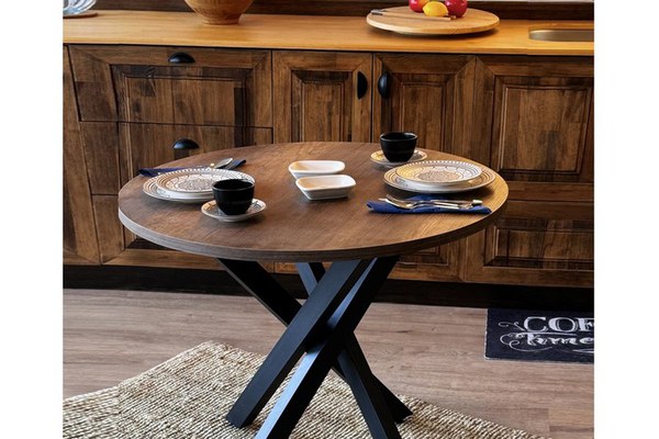 Blad MasaR:90 cmInaltime Masa74 cm CuloareNuc Culoare PicioareNegru Numar Picioare4 Picioare Forma masaRotund Fabricat dinMetal, Pal melaminat (25 mm) Numar de PersoanePeste 4