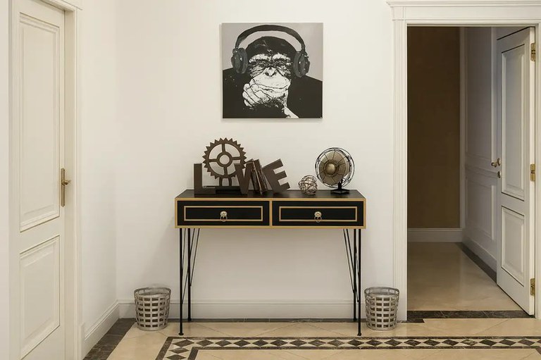 Masuta hol intrare vals Homs,120X90X35 cm- mai mult stil si functionalitateEconomiseste spatiu in gol si decoreaza cu o Masuta hol intrare vals Homs, perfecta pentru un apartament chic.Modelul in nuante elegante de negru si auriu este unul care combina atat functionalitatea cu eleganta intr-un mobilier deosebit si de efect. Masuta pastreaza cadrul cozy si boem, care face orice loc mai armonios si primitor, oriunde ai alege sa o amplasezi.Jocul cromatic aminteste de incaperile regale, unde finisajele glossy ale mobilei sunt completate de insertiile aurii, pretioase.Dimensiuni:L 1200, l 350, h 900 mmCum sa decorezi inspirat holul sau zona de lounge din livingIn functie de camera pe care te-ai hotarat sa o decorezi, te poti opri si la alte piese de mobila care sa intregeasca decorul. Stilul contemporan este unul versatil si inovator, care iti ofera numeroase posibilitati decorative din care rezultatul sa fie la cel mai inalt nivel.Atat in hol, cat si in living, poti opta pentru 2 sau 3 rafturi perete sau etajere perete pe care sa pui flori, carti, piese decorative sau chei si o geanta.Prezenta unei biblioteci living contribuie la crearea unei atmosfere primitoare, mai ales daca vorbim de o sufragerie ampla si luminoasa. Mai poti beneficia de spatiu extra de depozitare, cu dulapuri si corpuri living de mobila birou care sa-ti stocheze cartile, accesoriile utile pentru masina, solutii de curatenie, intr-un loc accesibil si ferit.Se livreaza neasamblata, impreuna cu schita si accesorii montaj. Asamblarea se realizeaza de catre cumparator. Curatarea se face cu o carpa alba moale si produse de curatenie neabrazive.