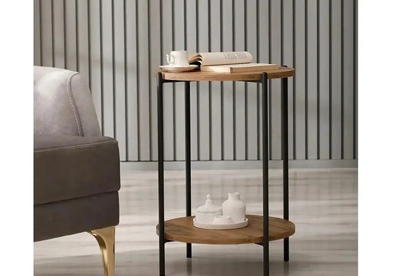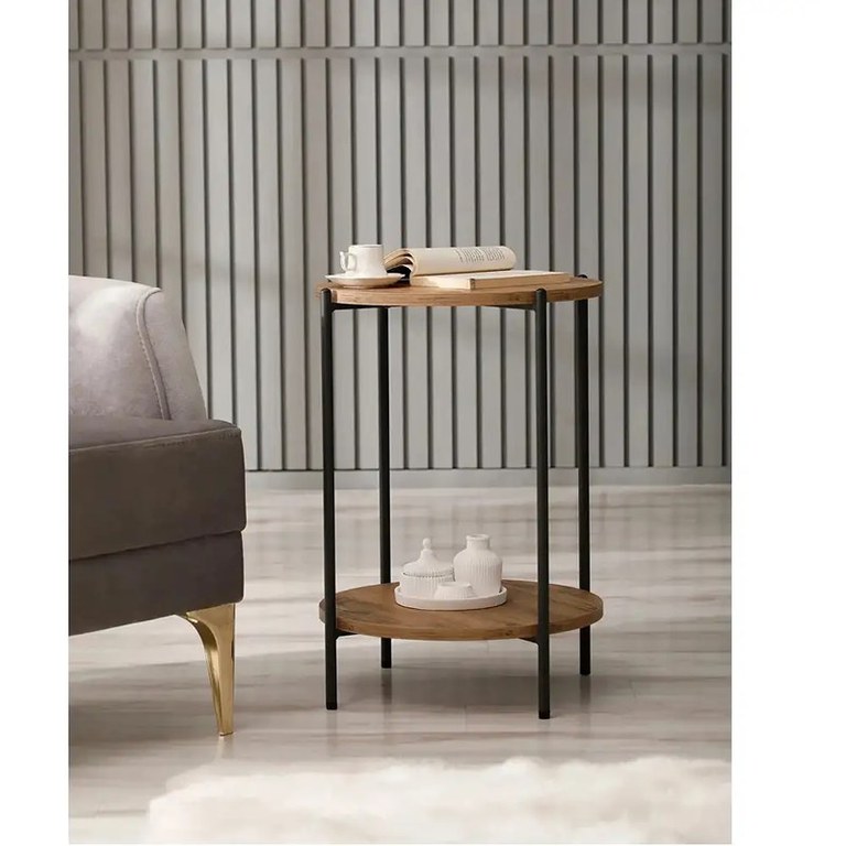 Descoperă masa laterală Homs - Un element practic, elegant și versatil, care nu ar trebui să lipsească din niciun living modernCu o estetică modernă și rafinată, masa laterală Homs a seriei AI este proiectată pentru a sublinia eleganța și rafinamentul oricărui decor. Profilul metalic negru adaugă un element de contemporaneitate și subliniază caracterul rafinat al acestei piese, în timp ce materialul din PAL, în culoarea nucului, aduce o notă de căldură și naturalețe în orice încăpere.Dimensiuni:Lățime: 40 cmAdâncime: 40 cmÎnălțime: 60 cmAvantaje:Ușor de instalat: Produsul este dezasamblat și poate fi instalat cu ușurință, fără a fi necesare cunoștințe avansate în montaj.Material durabil: Construit din profil metalic negru și PAL de 18 mm în culoarea nucului, masa laterală este robustă și rezistentă în timp.Suport pentru greutate: Poate suporta o greutate maximă de 10 kg, oferind suficient spațiu pentru obiectele tale de zi cu zi, precum lămpi, cărți sau decorațiuni. Explorează întreaga colecție de mese laterale Homs, optând fie pentru măsuțe cu rafturi integrate, fie pentru măsuțe cu coș de depozitare. Descoperă gama noastră de măsuțe de cafea și creează un loc de relaxare perfect în livingul tău!