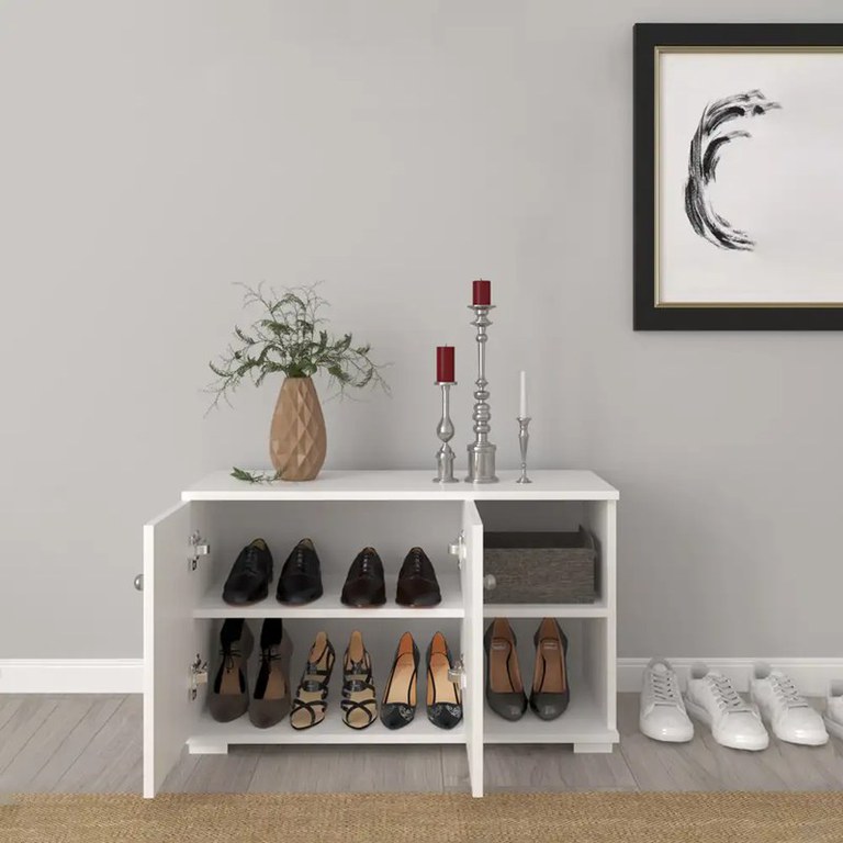 Pantofar Hol Royal Homs 90 cm - Soluție elegantă și practică pentru holul tăuPantofarul Royal Homs adaugă un plus de eleganță și rafinament în orice hol, oferind o soluție practică pentru depozitarea încălțămintei și a accesoriilor. Cu un design modern și un finisaj alb elegant, acest pantofar se integrează perfect în orice decor.Caracteristici și avantaje ale pantofarului Royal HomsÎn partea stângă, două uși tip dulăpior ascund două compartimente pentru încălțăminte, protejându-le de praf și păstrându-le la îndemână. În partea dreaptă, două rafturi deschise sunt ideale pentru depozitarea accesoriilor sau a obiectelor mici, precum căciuli, mănuși sau genți.Fabricat din PAL melaminat de înaltă calitate, pantofarul este rezistent la uzura zilnică și ușor de curățat, oferind durabilitate pe termen lung.Finisajul alb adaugă un aer curat și modern, făcându-l ușor de integrat în orice tip de decor, de la cel clasic la cel contemporan.Descoperă întreaga gamă și explorează colecțiile de mobilier pentru holDacă îți place acest model de pantofar Royal Homs, îți recomandăm să explorezi întreaga gamă de mobilier pentru hol și să descoperi diverse piese precum: cuiere, comode sau alte modele de pantofare.DimensiuniLungime : 90 cm,Inaltime : 52.5 cm,Latime : 33 cm.1 colet